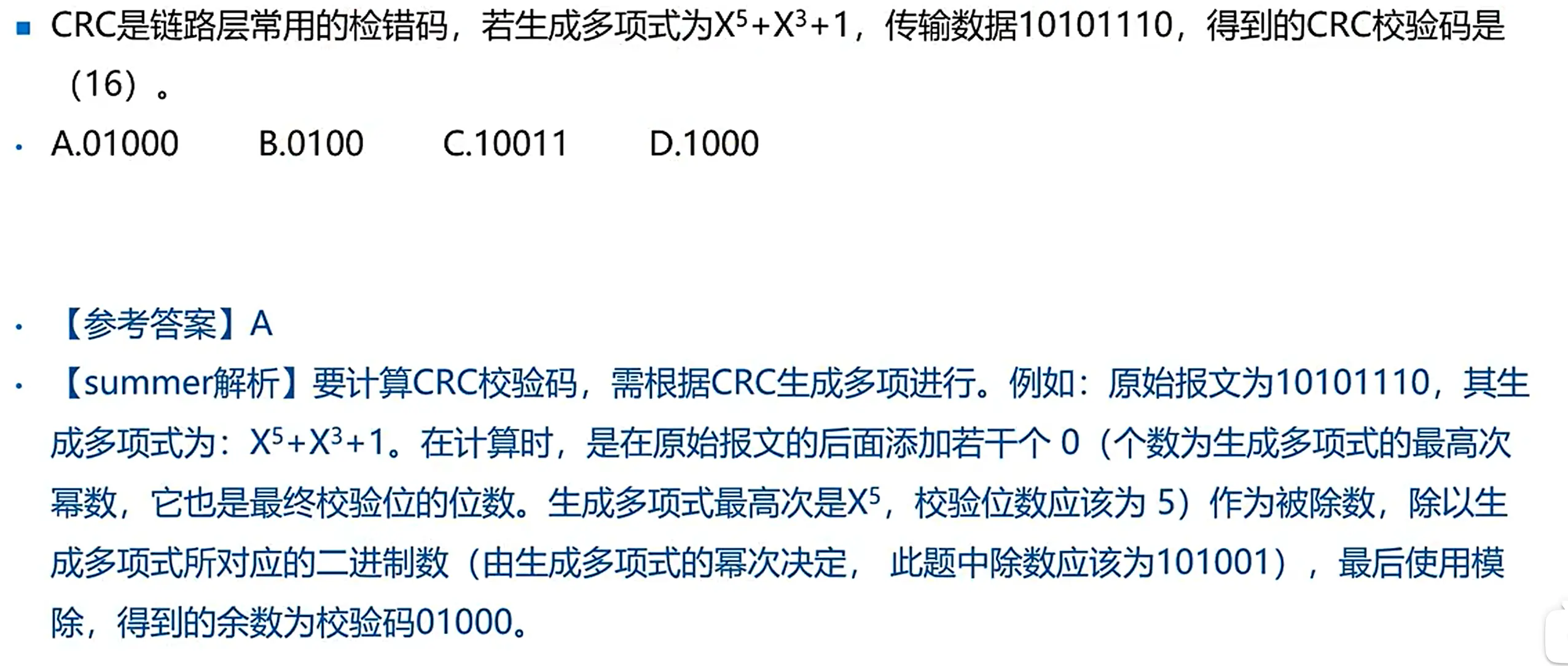 采用CRC,生成多项式为G(x) = x4 + x + 1,信息码是10111,则计算出CRC是什么?