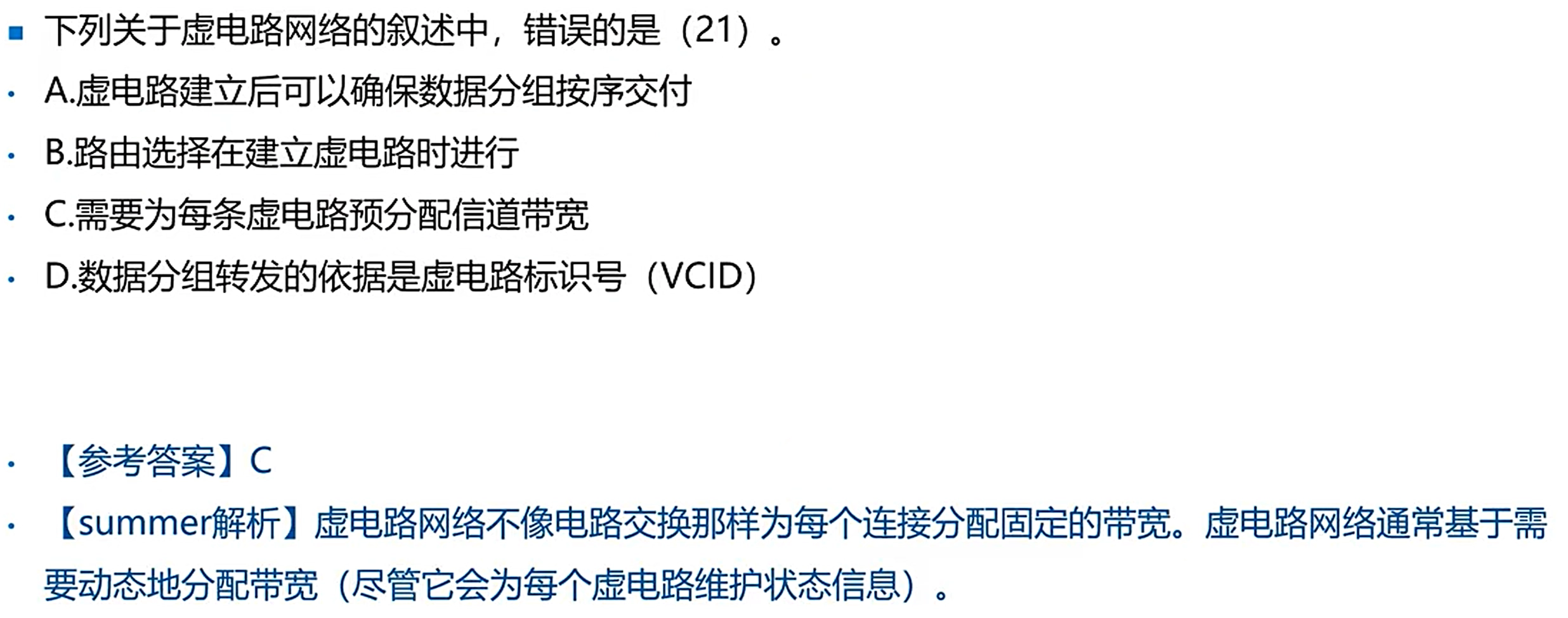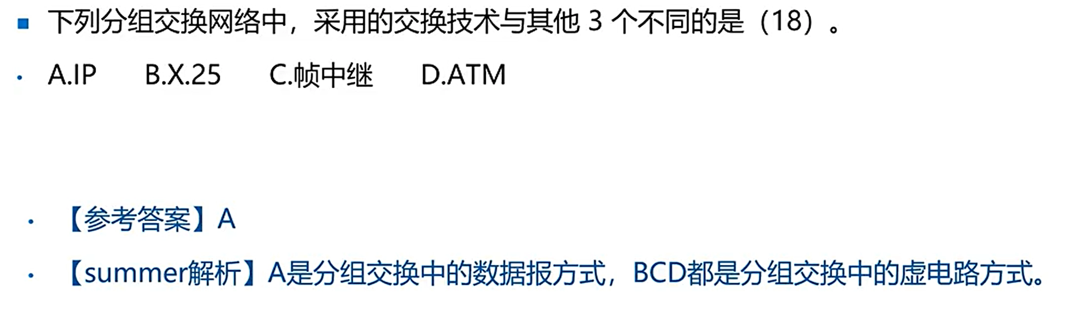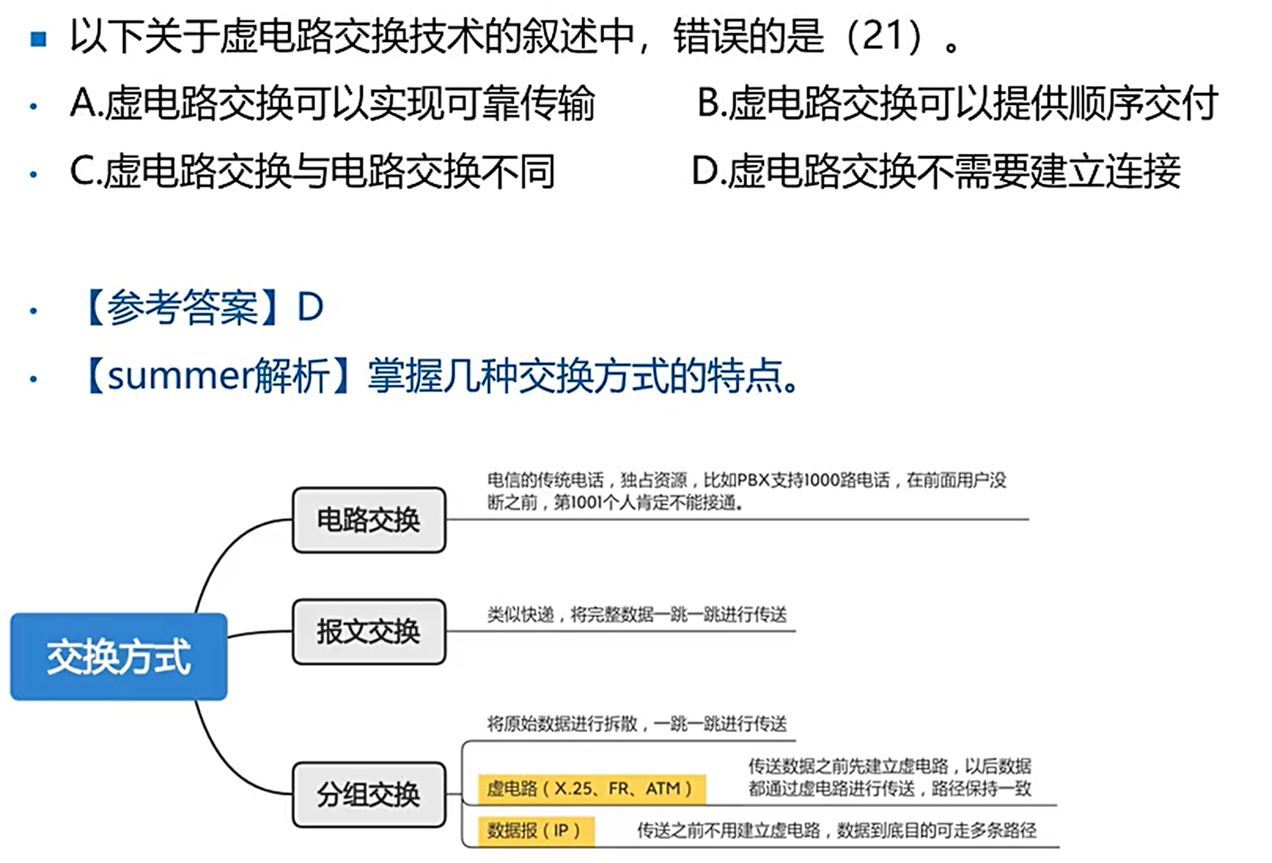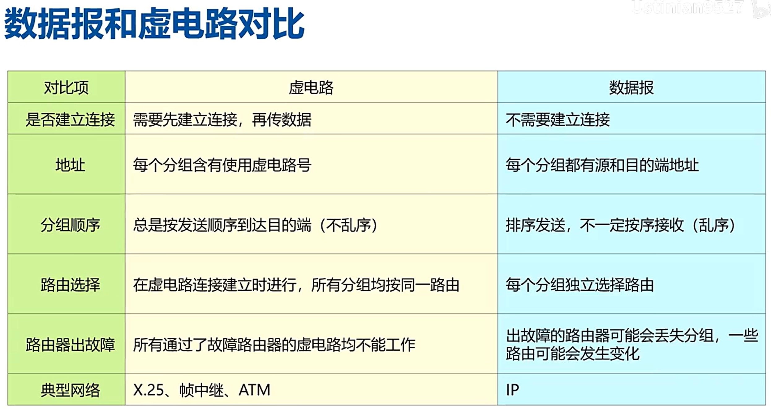 - 虚电路:在数据传送前先建立一条逻辑上的连接,每个分组都按这条路径进行传输,不会乱序。(ATM,X.25,FR)